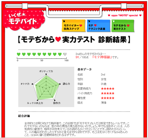 アルバイト探しはOPPOにある「モテぢから★実力テスト」の私の結果です。